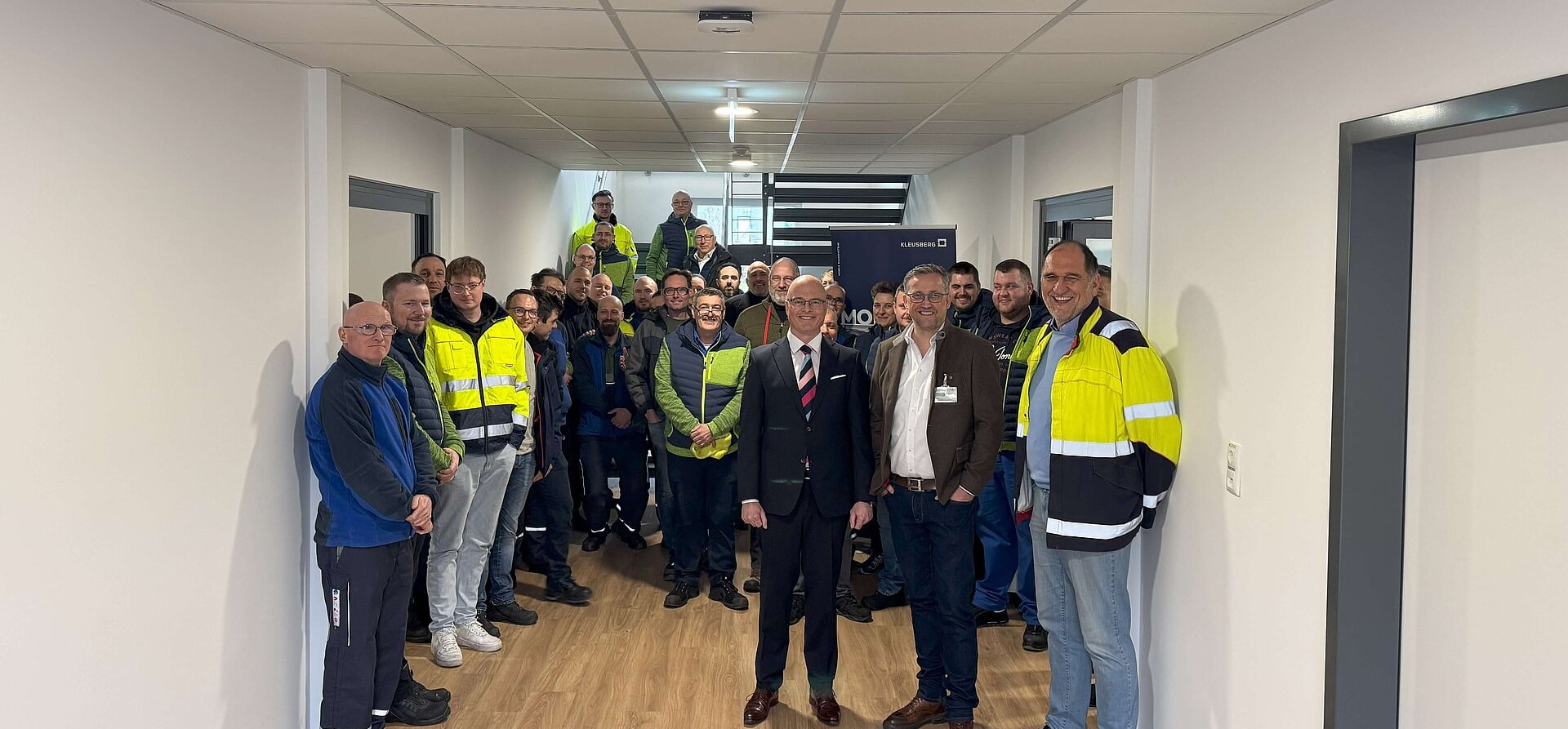 Nach einer langwierigen Abrissphase des Bestandsgebäudes waren die Mitarbeiter*innen von Nobian erleichtert, dass die offizielle Übergabe des neuen Gebäudes bereits nach 5 Monaten Bauzeit erfolgen konnte. Bei der Einweihung begrüßten Ingolf Hartmann (Maintenance Support & Facility Manager) und Klaus H. Kuhlage (Site Director) von Nobian gemeinsam mit Torsten Höfer, Geschäftsführer von KLEUSBERG, die Belegschaft und künftigen Nutzer des Bürogebäudes.