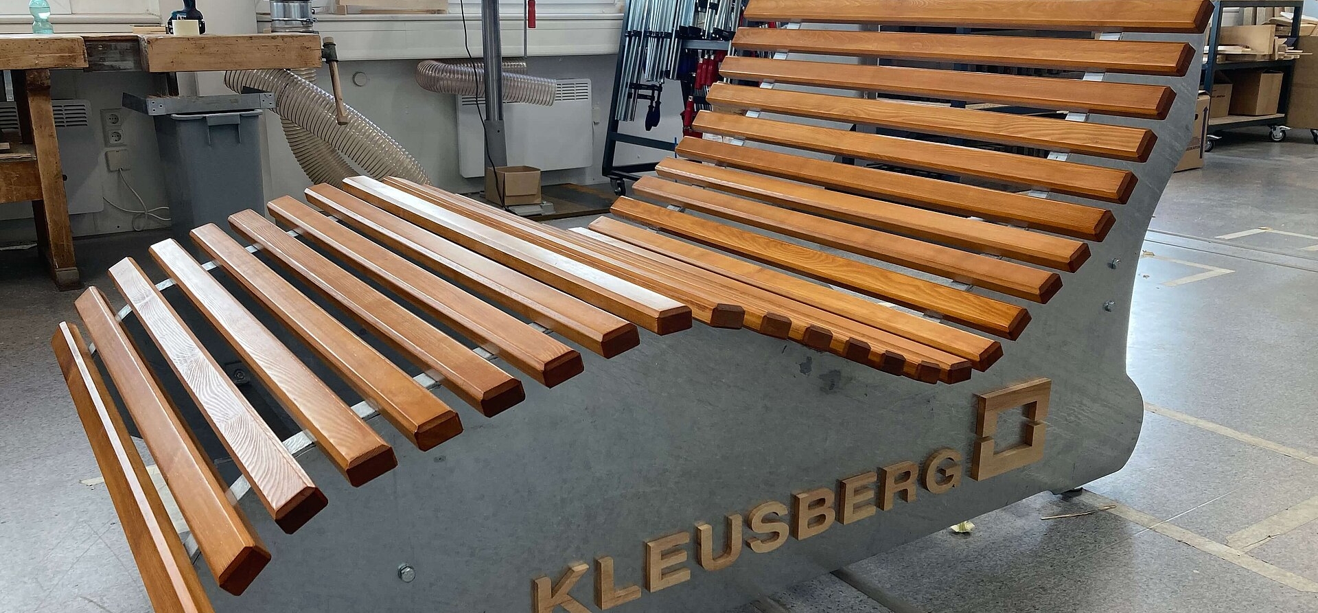 Ebenfalls stand als Ausstellungsobjekt das von den Dualen Student:innen geplante und von den Auszubildenden Konstruktionsmechanikern aus massiven naturbelassenen Stahlplatten geschweißte „XXL-Insektenhotel". Von vorneherein war vorgesehen, dass dieses Unikat nach der Messe sinnvoll genutzt werden soll. KLEUSBERG hat sich dazu entschieden, das Insektenhotel sowie eine weitere Relaxliege an die Verbandsgemeinde Wissen zu spenden.