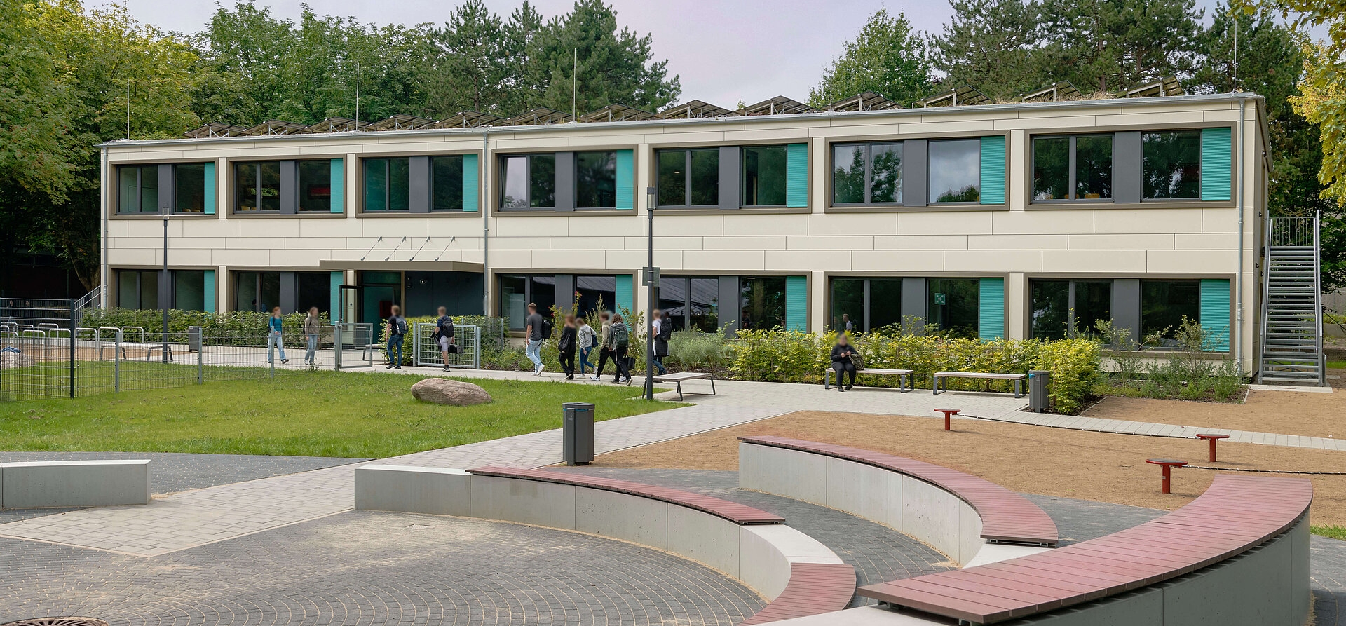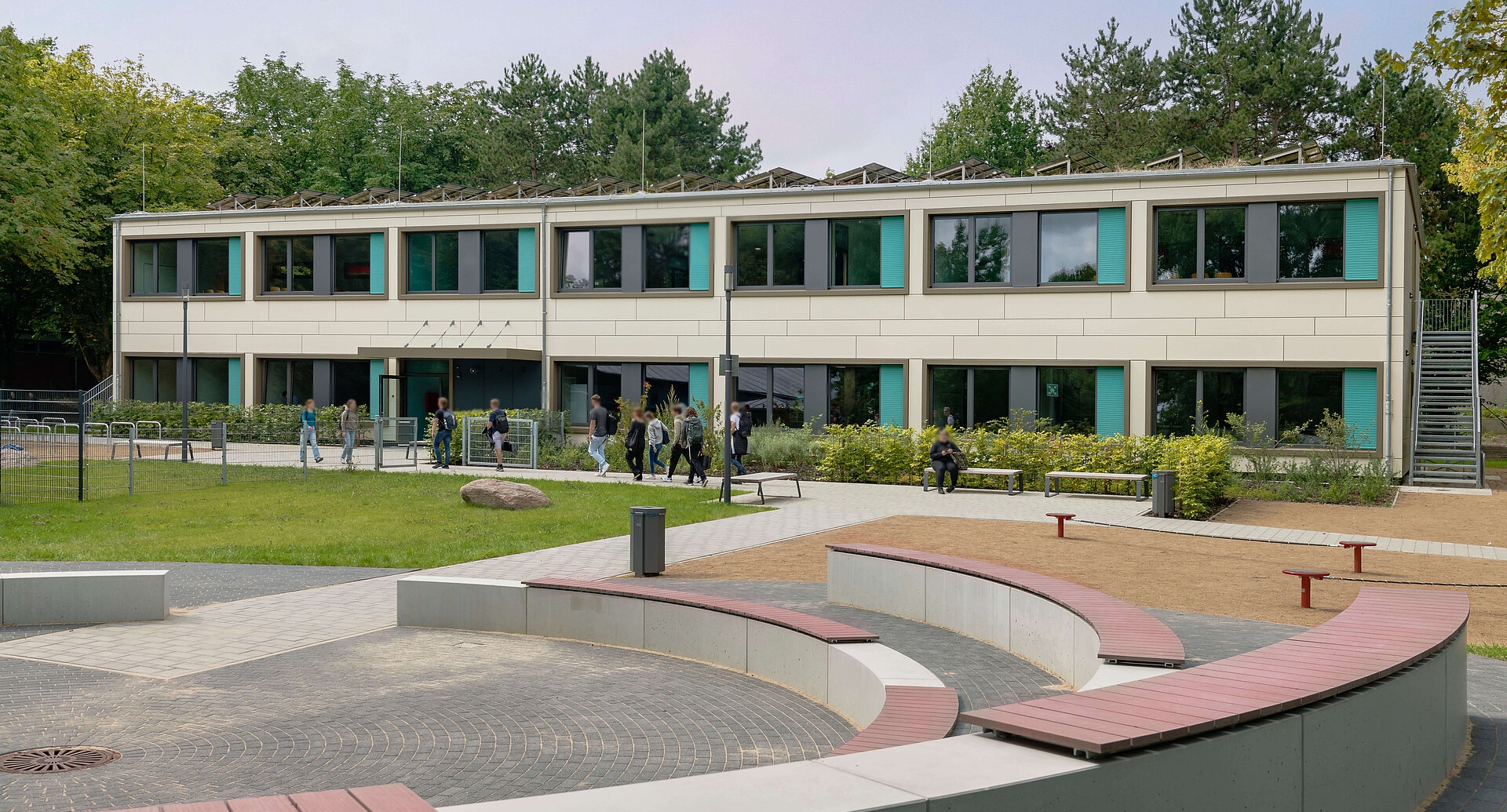Die Planungsverantwortlichen haben sich hier eng mit allen Beteiligten abgestimmt. So entschied man sich für ein modulares System mit einer universalen Grundstruktur, die eine flexible Raumnutzungen erlaubt. Vom traditionellen Frontalunterricht über Lerncluster bis hin zu offenen Lernlandschaften ist alles möglich. 2- oder 3-geschossig je nach Bedarf und auch eine freie Gestaltung der Fassaden wie z.B. Klinker, Holz oder farbige Elemente ermöglichen die Anpassung an das Bestandsumfeld. Durchgängig wurde auf begrünte Dachflächen, Photovoltaikanlagen sowie eine auf dem neuesten energetischen Stand installierte Haustechnik bestanden.