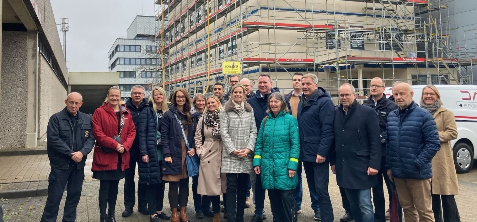 Zu der Feierlichkeit fanden sich der Oberbürgermeister Jürgen Krogmann, Vertreter:innen des Verwaltungsrates aus den sechs Trägerkörperschaften, beteiligte Planende und Ausführende sowie Mitarbeitende der Leitstelle zusammen, die das Projekt initialisierten. Bereits beim Einzug der Großleitstelle in das Bestandsgebäude 2012 stand fest, dass der Platz zukünftig nicht ausreichen wird. Durch die wachsende Zahl an Anrufen und Einsätzen wuchs gleicherweise der Bedarf an Personal und Raum, den KLEUSBERG mit dem viergeschossigen Neubau ermöglichte.