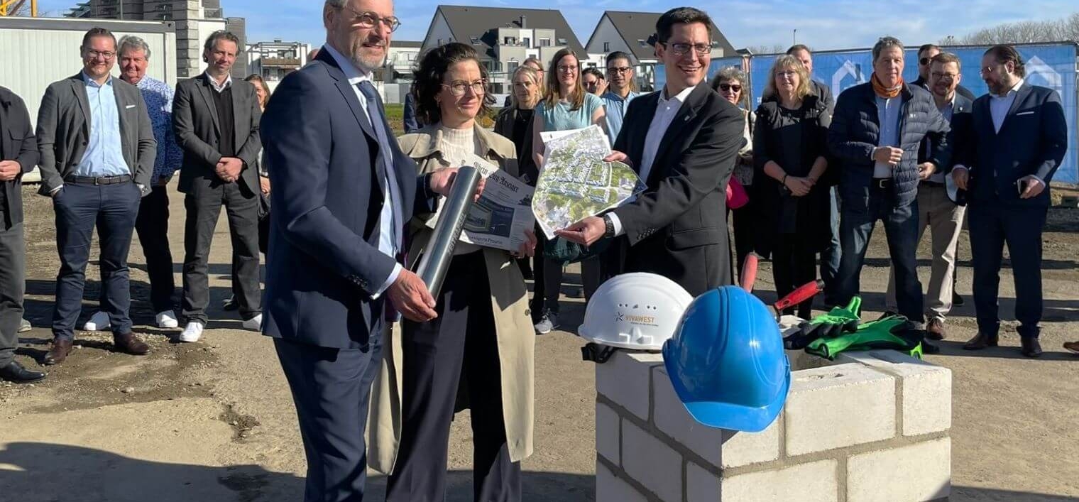 Am 14.03.2024 fand vor Ort die Grundsteinlegung des Quartiers statt. Uwe Eichner, Vorsitzender der VIVAWEST-Geschäftsführung, Bürgermeister Dr. Max Leitterstorf und die beteiligten Projektpartner feierten bei bestem Wetter gemeinsam die symbolische Grundsteinlegung und versenkten gemeinsam eine Zeitkapsel.