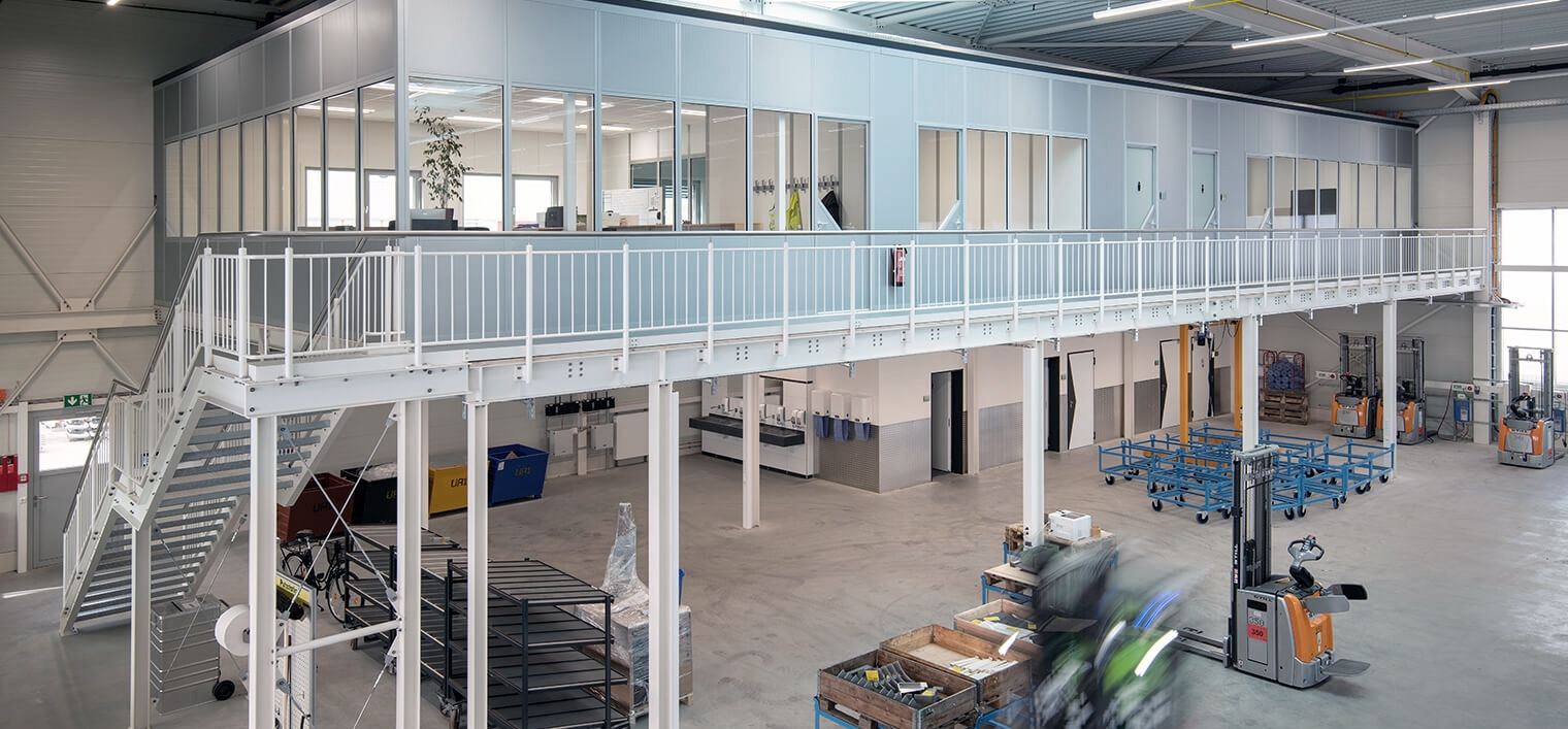 Er, als direkter Nutzer dieser Räume, zeigt sich begeistert von der Ausführung und Qualität. Nicht nur hinsichtlich des Zugewinns weiterer Büros, Aufenthalts-, Umkleide- und Sanitärbereiche sieht das Unternehmen für sich den Vorteil im System. Durch beispielsweise die Ausführung auf einer vorhandenen Bühnenkonstruktion konnten Freiflächen erhalten bleiben, die nun für Lagerzwecke genutzt werden und Zugänge zu vorhandenen Räumen innerhalb der Halle bieten. Bei anderen Anbietern wäre dies nur bedingt möglich gewesen. Die Anpassungsfähigkeit der einzelnen Wandelemente ermöglichte die Anbindung an Hallenwände und eine optimale Integration in die bestehende Produktionsumgebung. Vorhandene Stützen und Träger wurden ausgespart und die einzelnen Sandwichpaneele an die Gegebenheiten angepasst. Darüber hinaus konnten Außenfenster der Produktionshalle in den Räumen integriert und so das Tageslicht sinnvoll genutzt werden. „Durch die werksseitige Vorfertigung der Elemente bei KLEUSBERG ist während der eigentlichen Montage – die übrigens im laufenden Betrieb durchgeführt wurde – vergleichsweise wenig Schmutz entstanden. Die Wände waren bereits so vorbereitet, dass nur noch kleine Ausschnitte vorgenommen werden mussten. Ansonsten ging die Montage zügig voran“, so Markus Kuhn in einem Interview.