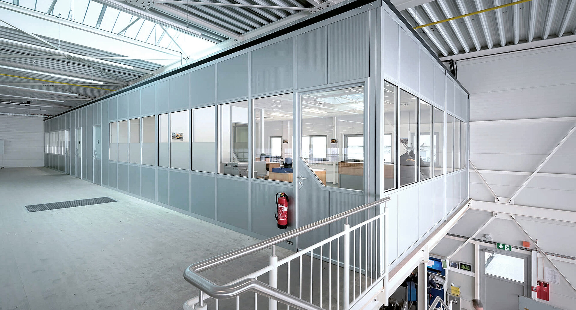 Folierungen an Fenstern und Türen schaffen in Teilbereichen mehr Privatsphäre und ermöglichen ein ungestörtes und unbeobachtetes Arbeiten. Ansonsten sind die Räume von Sichtglas geprägt, was eine klare Übersicht in das Produktionsgeschehen ermöglicht. Um eine bessere Schalldämmung zu erzielen, entschloss sich der Bauherr für eine Steinwollfüllung. Weitere Maßnahmen, die dahingehend ergriffen wurden, stellen die Doppelverglasungen (26mm statt Standard-Floatglasfüllung mit 6 mm), Türbodendichtungen sowie die Schallschutz-Dichtbänder für Stöße und Fugen an den Wandelementen dar. Aufgrund guter Erfahrungen bei einem vorangegangenen Projekt hat Liebherr auch hier auf eine ähnliche Ausführung gesetzt und ruhige Arbeitsräume für die Mitarbeitenden geschaffen. Die Elektroinstallationen erfolgten bauseits. KLEUSBERG hat die Projektbeteiligten durch sein Know-How und die langjährige Erfahrung bei der Planung und Umsetzung dieses Gewerkes unterstützt. Die Ausführungsdetails des Systemraums richteten sich nach einer ebenfalls in der Halle und auf Bühnenkonstruktion errichteten Raum-im-Raum-Lösung von KLEUSBERG: Ziel war es die räumliche Erweiterung möglichst ähnlich auszuführen, um ein homogenes Gesamtbild zu schaffen. Das ist KLEUSBERG zur vollen Zufriedenheit des Kunden gelungen.