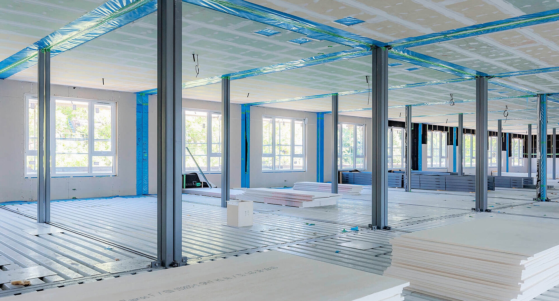 Aufgrund der Wiederverwendbarkeit der einzelnen Raummodule kann der Energiebedarf für die Herstellung der Baustoffe – insbesondere bei Stahl – auf verschiedene Nutzungsphasen verteilt werden. Dieser Vorteil wird mit der Anzahl der Lebenszyklen gegenüber anderen Bauweisen immer größer. Außerdem: Die „graue Energie“ eines Gebäudes – auch als Primärenergie bezeichnet – kann durch das Wiederverwenden von Bauteilen verringert werden. 56 % der Primärenergie eines Gebäudes entfallen auf den Rohbau. Darin enthalten ist die Energie, die zum Gewinnen von Materialien, Herstellen und Verarbeiten von Bauteilen, für etwaige Transporterfordernisse, den Einbau von Bauteilen sowie die Entsorgung anfällt. Bei einem Stahlmodulgebäude können mindestens 96 Prozent aller Baustoffe wiederverwendet werden. Auch das Bauen mit Holz und damit die Abkopplung von fossilen Energiequellen wirkt sich positiv auf den Anteil grauer Energie aus. Es gibt unterschiedliche Ansätze bzw. Handlungsempfehlungen bei der Wiederverwendung von Gebäuden. Neben „disign for disassembly“ und „selektivem Rückbau“ zählt auch das „modulare Bauen“ konkret dazu. Darauf bezogen schlägt KLEUSBERG umgangssprachlich zwei Fliegen mit einer Klappe. Denn die Gebäude werden nicht nur modular errichtet, sondern lassen sich am Ende einer Nutzungsphase wieder leicht zerlegen, wiederverwenden und umnutzen. Das Entwickeln von nutzungsoffenen Grundrissen stellt eine Strategie dar, die beim zirkulären Bauen Anwendung findet und bei KLEUSBERG gelebte Praxis ist. Gebäude, die heute für Bürozwecke genutzt werden, können später zu Wohnräumen umfunktioniert werden. Möglich ist dies durch nicht tragende Innen- sowie Außenwände und somit maximale Flexibilität bei der Raumaufteilung. Bereits in der Planungsphase wird beispielsweise die Nachnutzung oder auch eine mögliche Gebäudeaufstockung und/oder -erweiterung berücksichtigt. Diese Optionen tragen dazu bei, dass sämtliche Bedarfssituationen abgedeckt werden und ein Gebäude tendenziell länger in Nutzung befindlich bleibt.