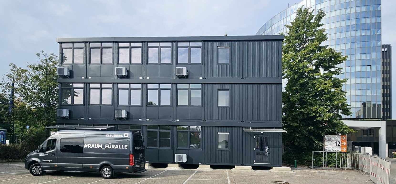 Die Sanierung des Verwaltungshochhauses umfasst sowohl die Erneuerung der Fassade als auch weitreichende Umbaumaßnahmen in den Bürobereichen. Um während dieser Zeit einen durchgehenden und effizienten Verwaltungsbetrieb zu gewährleisten, stellt KLEUSBERG ab Herbst 2025 moderne Bürocontainer als Interimslösung bereit. Geplant ist die Errichtung von acht 2- und 3-geschossigen Anlagen mit insgesamt 608 Einheiten. Diese Gebäude bieten den Mitarbeitenden eine hochwertige und funktionale Arbeitsumgebung. Die Nutzung dieser Interimslösung ist für eine Mietdauer von rund 30 Monaten vorgesehen. Das erste Interimsgebäude hat KLEUSBERG bereits realisiert. Weitere folgen.
