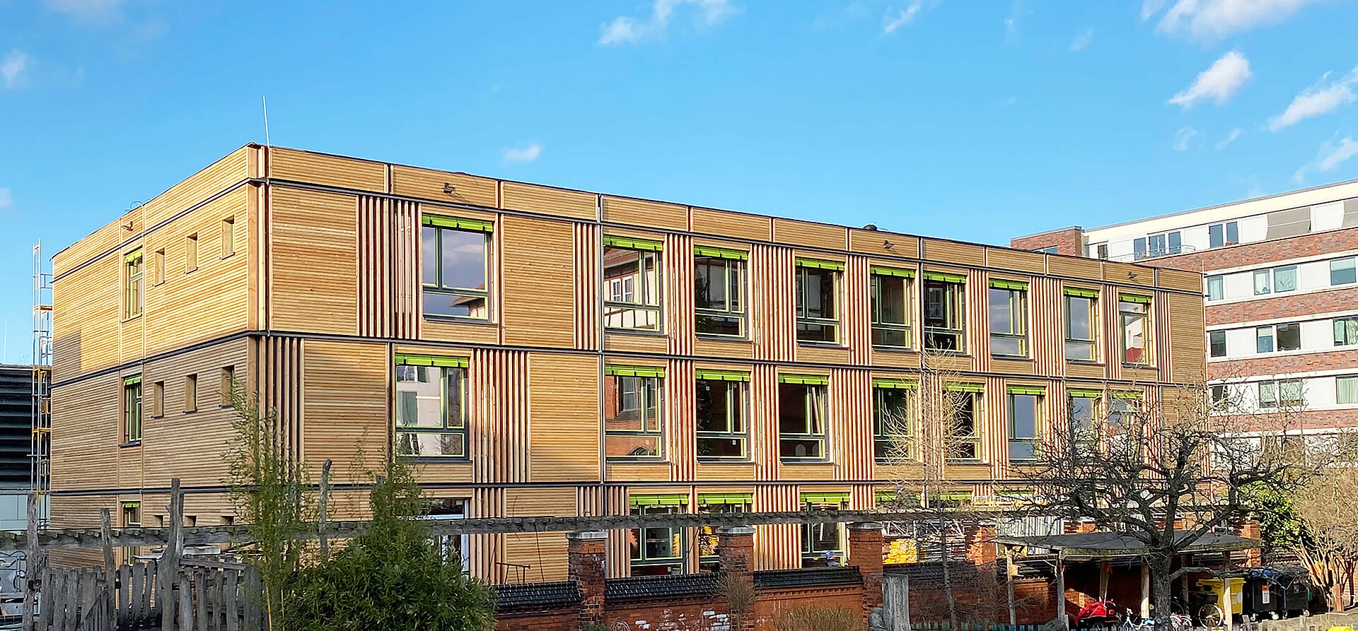Neben modularen Kombinationen aus Stahl und Holz sind auch konventionelle Bestandteile wie z. B. eine Tiefgarage in Stahlbetonbauweise oder die Erschließungen über Treppenhäuser und Aufzugsschächte aus Betonfertigteilen z. B. aus Brandschutzanforderungen an der Tagesordnung. Unsere Kund:innen und Bauherr:innen fordern von uns grundsätzlich schlüsselfertige oder sogar löffelfertige, also komplett nutzungsgerecht eingerichtete Gebäude. Am Ende ist kein Übergang der Systeme im fertigen Gebäude mehr erkennbar. Sämtliche Funktionen werden von uns als Generalunternehmen bausystemübergreifend sichergestellt.