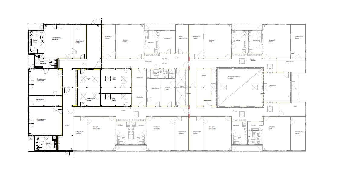 Neben zwei weiteren Gruppen- und dazugehörigen Nebenräumen schafft der Anbau auf 540 m² Bruttogeschossfläche Platz für einen sogenannten "Snoezelbereich" (Schonraum/Rückzugsort) sowie ein Eltern-Café. Zusätzliche 7 Lichtkuppeln sorgen für das nötige Tageslicht und eine angenehme Raumatmosphäre.