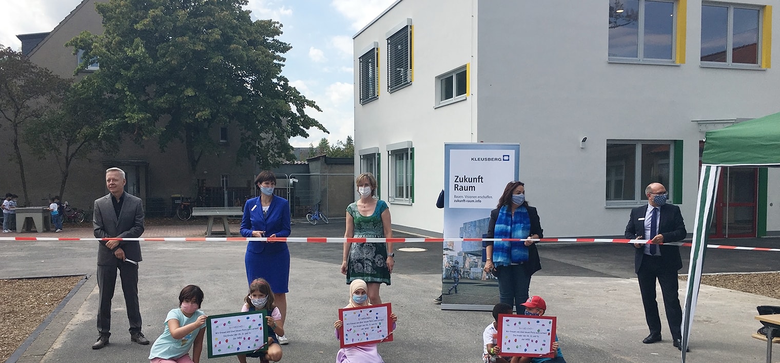 Mittwoch, den 19. August 2020 fand ein Tag der offenen Tür statt. Das Zusammentreffen wurde genutzt, um den Erweiterungsbau der Wilhelm-Busch-Grundschule noch mal offiziell und öffentlich vorzustellen. Bürgermeisterin Birgit Alkenings begrüßte die Gäste in Hilden persönlich und schnitt gemeinsam mit anderen Projektverantwortlichen und Vertretern der Stadt Hilden das symbolische Absperrband durch.