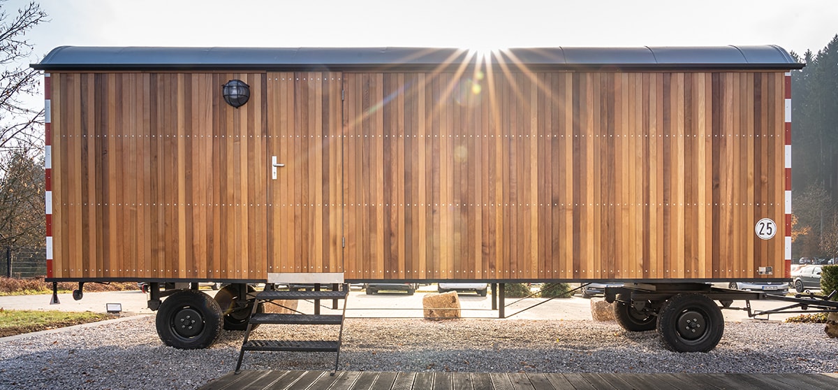 Schon von außen fällt die Holzfassade aus Zedernholz sofort ins Auge. Im Innenbereich sind es die gemütliche Sitzecke inklusive Eckbank und ein Pelletofen, die den Charme des neuen Besprechungsraums ausmachen. Eine Fußbodenheizung sowie ein Elektro-Wandkonvektor sorgen zusätzlich für angenehme Temperaturen auch in der kalten Jahreszeit. Genutzt wird der Bauwagen sowohl für interne Meetings als auch für Kundenbesuche.