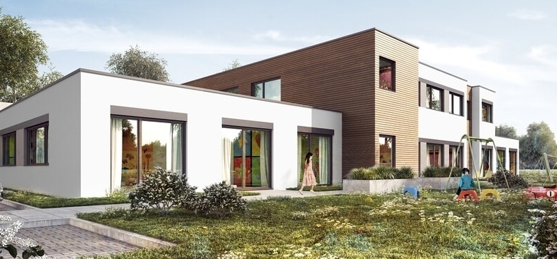 Die Modulbauweise von KLEUSBERG ermöglicht diesen engen Zeitplan, da die im Werk vorgefertigten Module bereits sämtliche Versorgungsinfrastrukturen beinhalten sowie alle Anforderungen an Brand- und Schallschutz erfüllen. Zusätzlich wird wertvolle Zeit gewonnen, da KLEUSBERG sich bereits mit der kind- und seniorengerechten Ausstattung und Ausgestaltung der Gebäude auskennt und damit von vornherein alle Auflagen erfüllt. Die kombinierte Einrichtung wird in einem Neubaugebiet errichtet. Nach Fertigstellung wird das Modulgebäude sowohl in seiner Architektur als auch in der Innenausstattung hohe Ansprüche erfüllen. Große Fensterflächen und klare Gebäuderiegel dominieren die Formensprache.