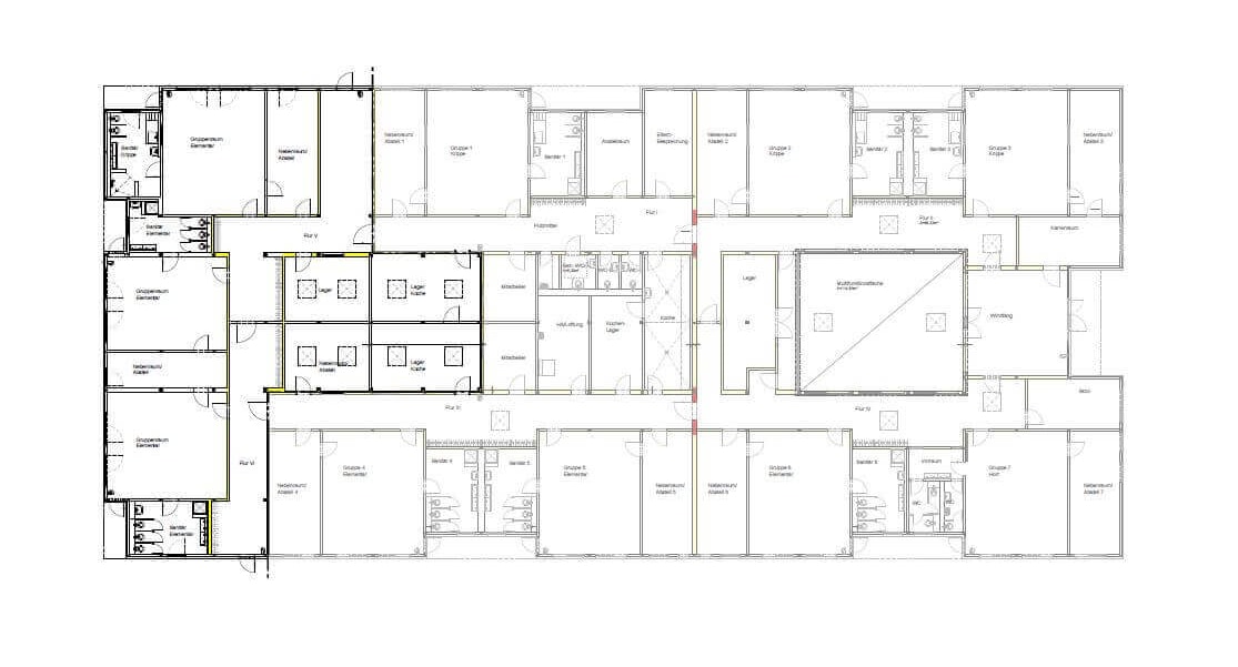 Neben zwei weiteren Gruppen- und dazugehörigen Nebenräumen schafft der Anbau auf 540 m² Bruttogeschossfläche Platz für einen sogenannten "Snoezelbereich" (Schonraum/Rückzugsort) sowie ein Eltern-Café. Zusätzliche 7 Lichtkuppeln sorgen für das nötige Tageslicht und eine angenehme Raumatmosphäre.
